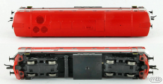 | dieselová lokomotiva červená-bílá, černý rám a podvozky |