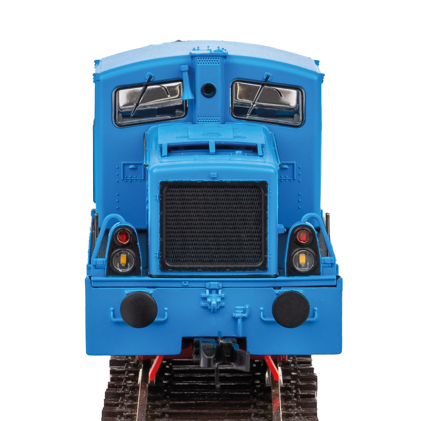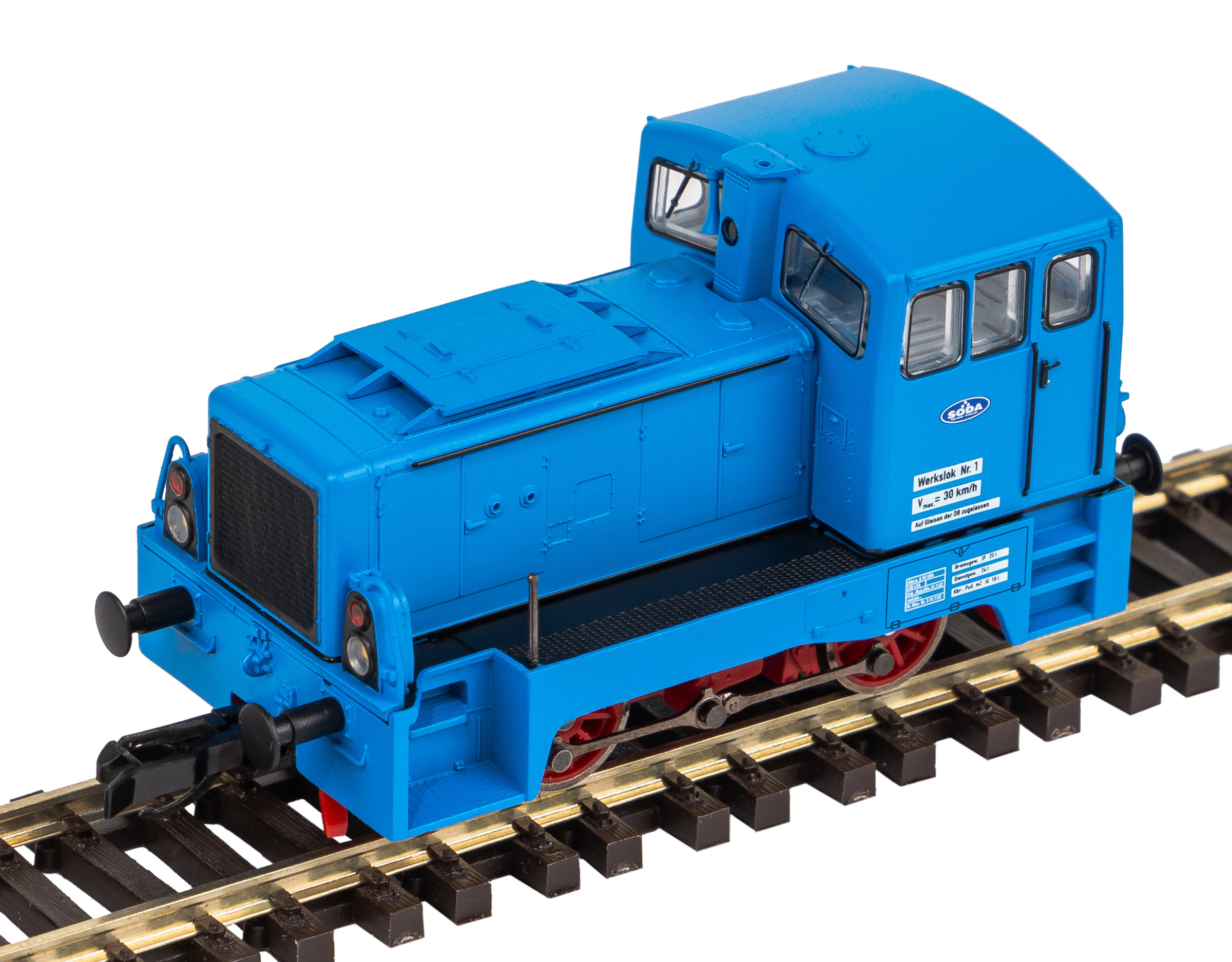 | dieselová lokomotiva modrá s červeným pojezdem „SODA“ |