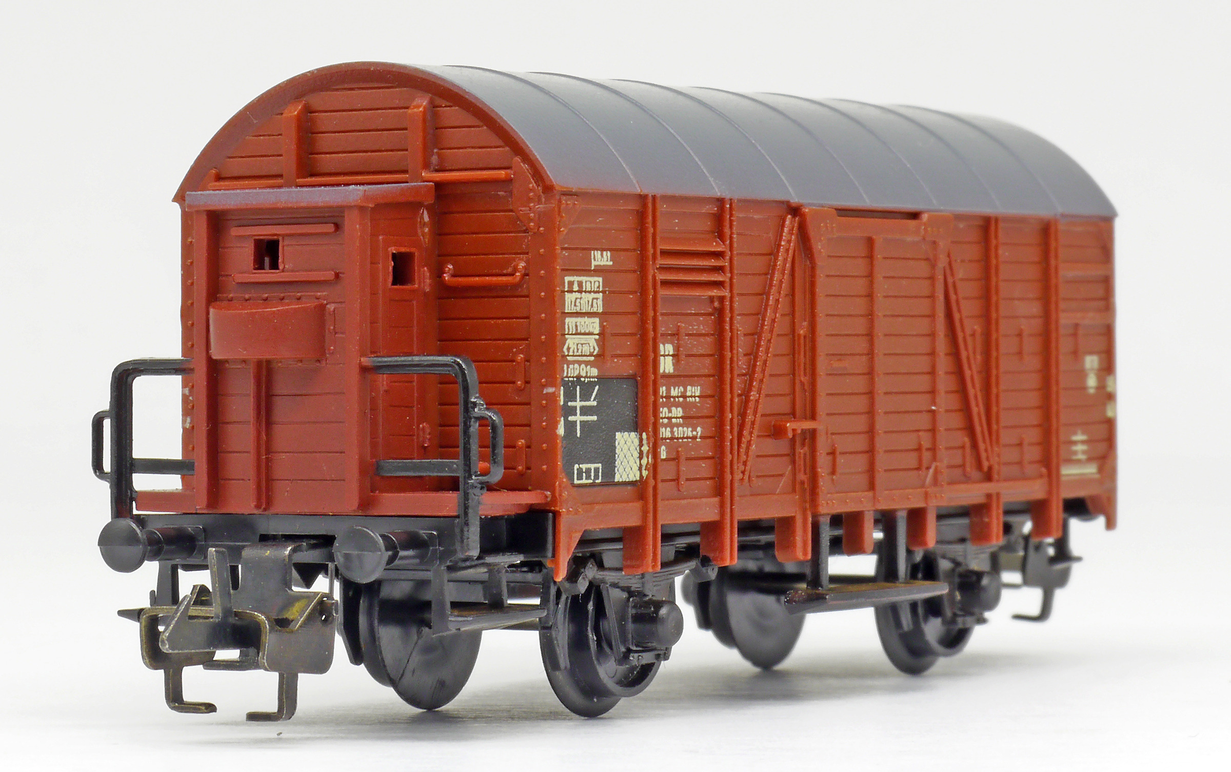 | krytý nákladní vůz červenohnědý s černou střechou a s brzdařskou budkou |