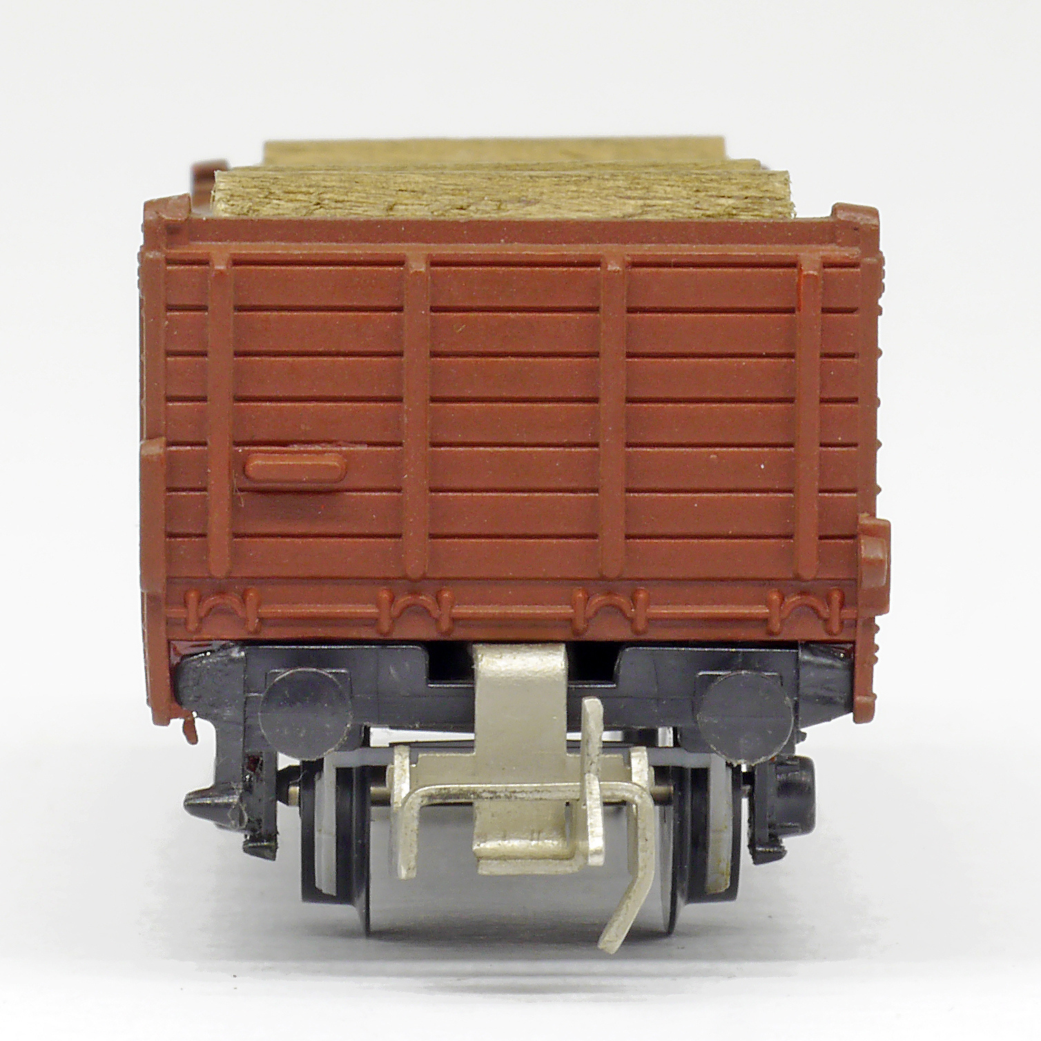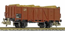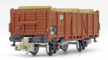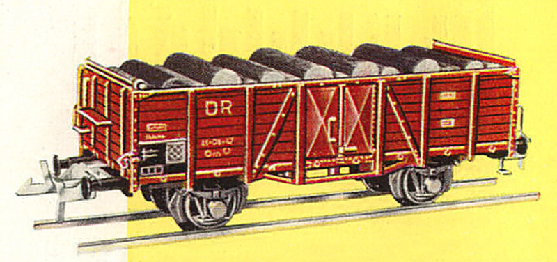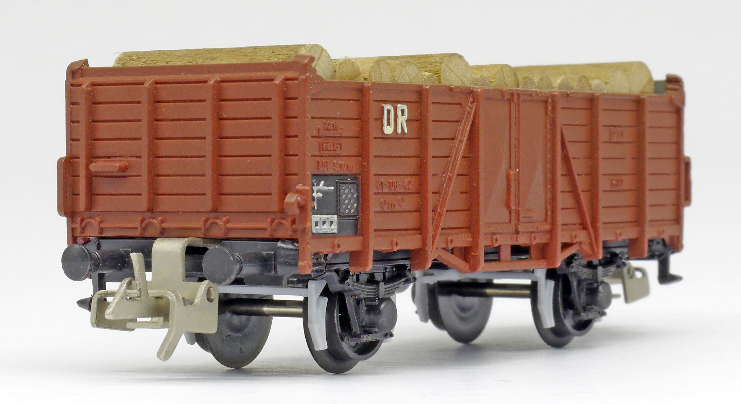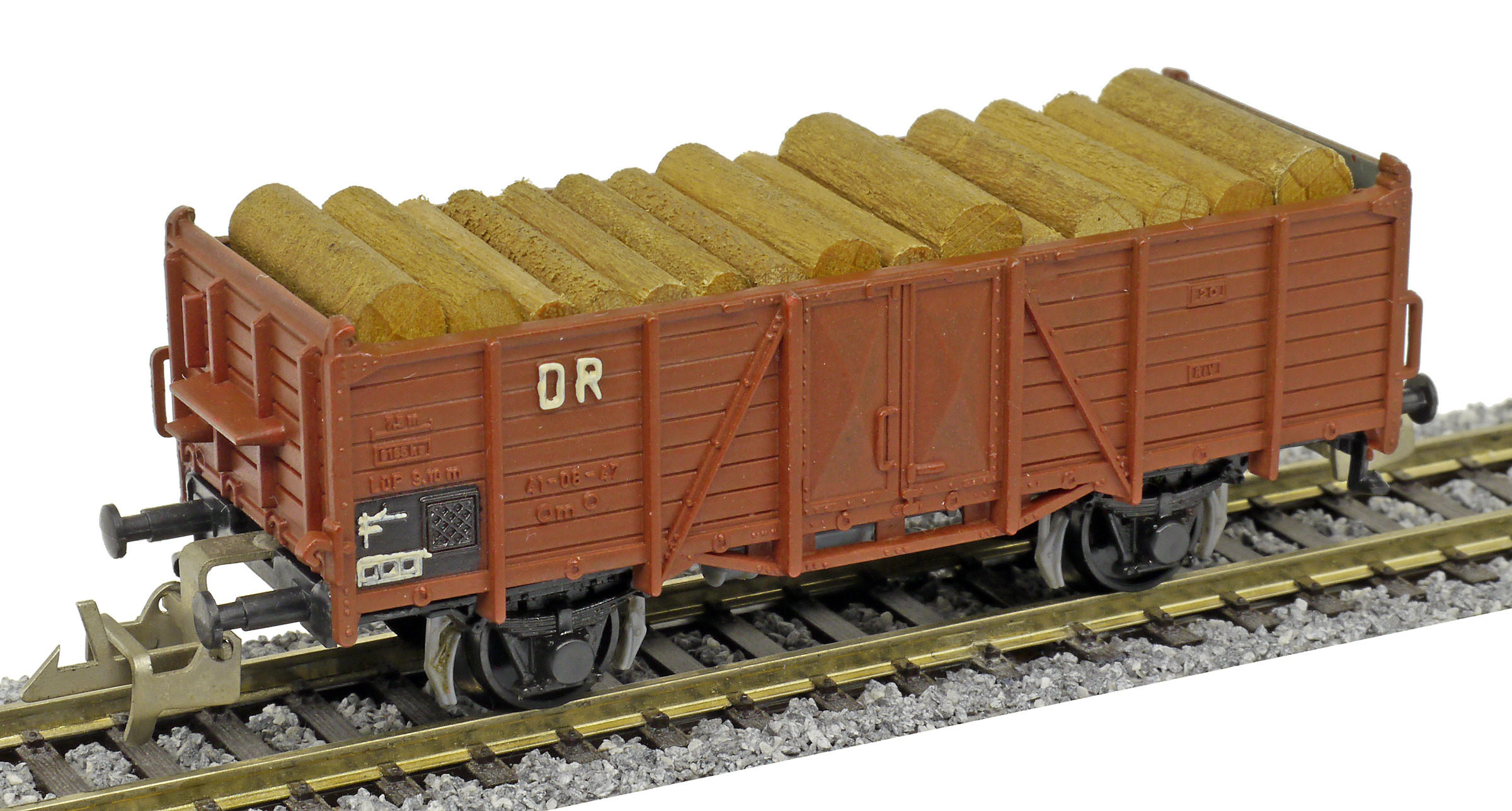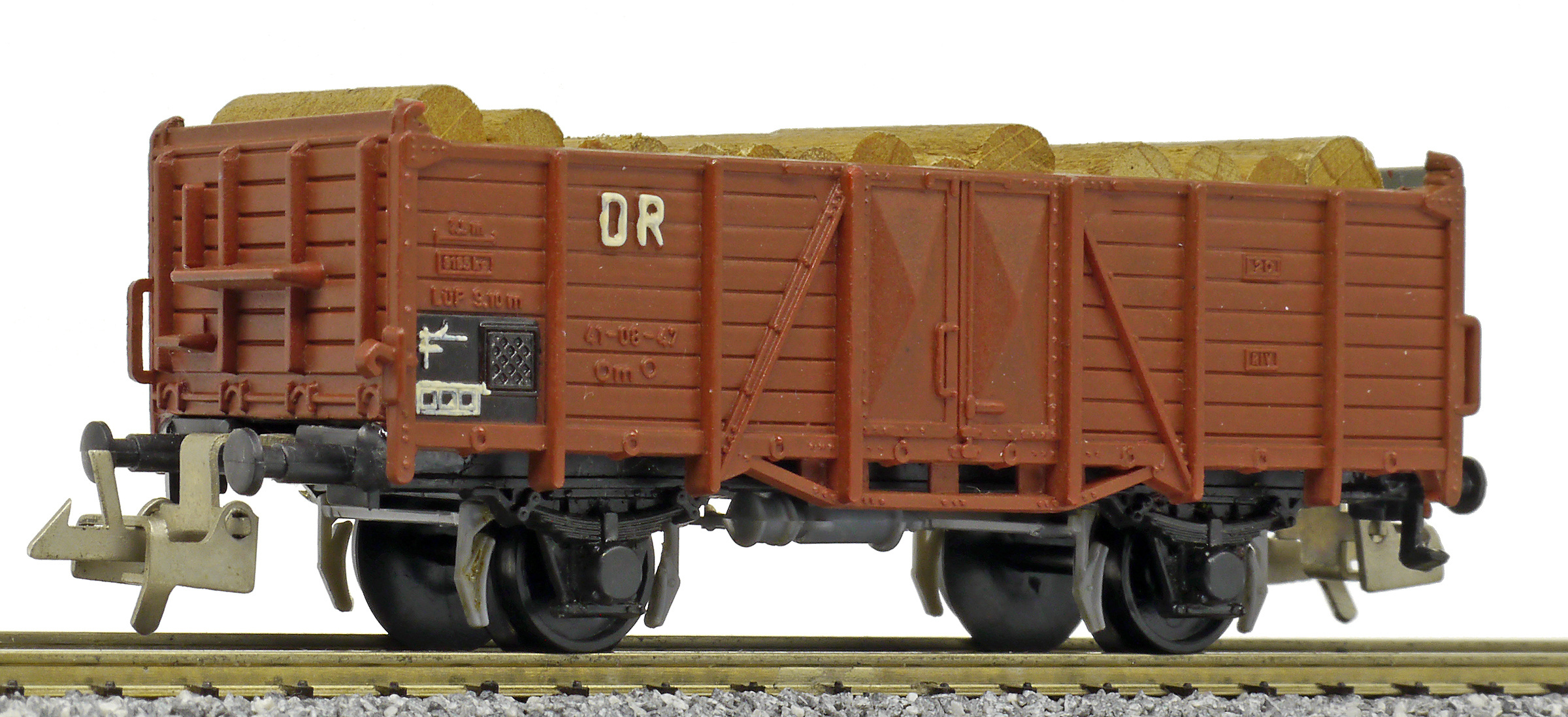 otevřený nákladní vůz červenohnědý s nákladem kulatiny