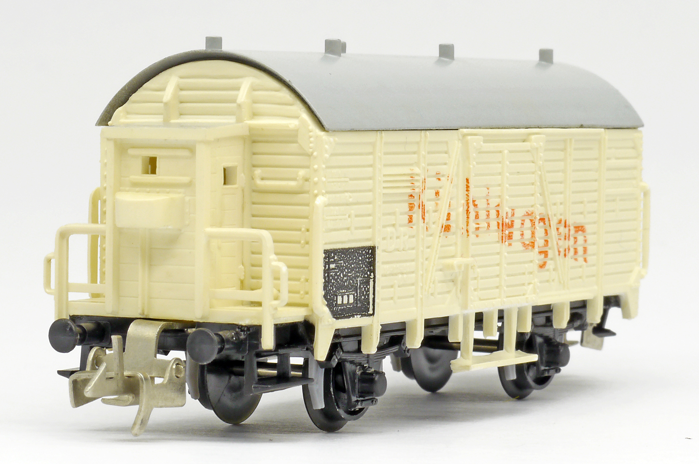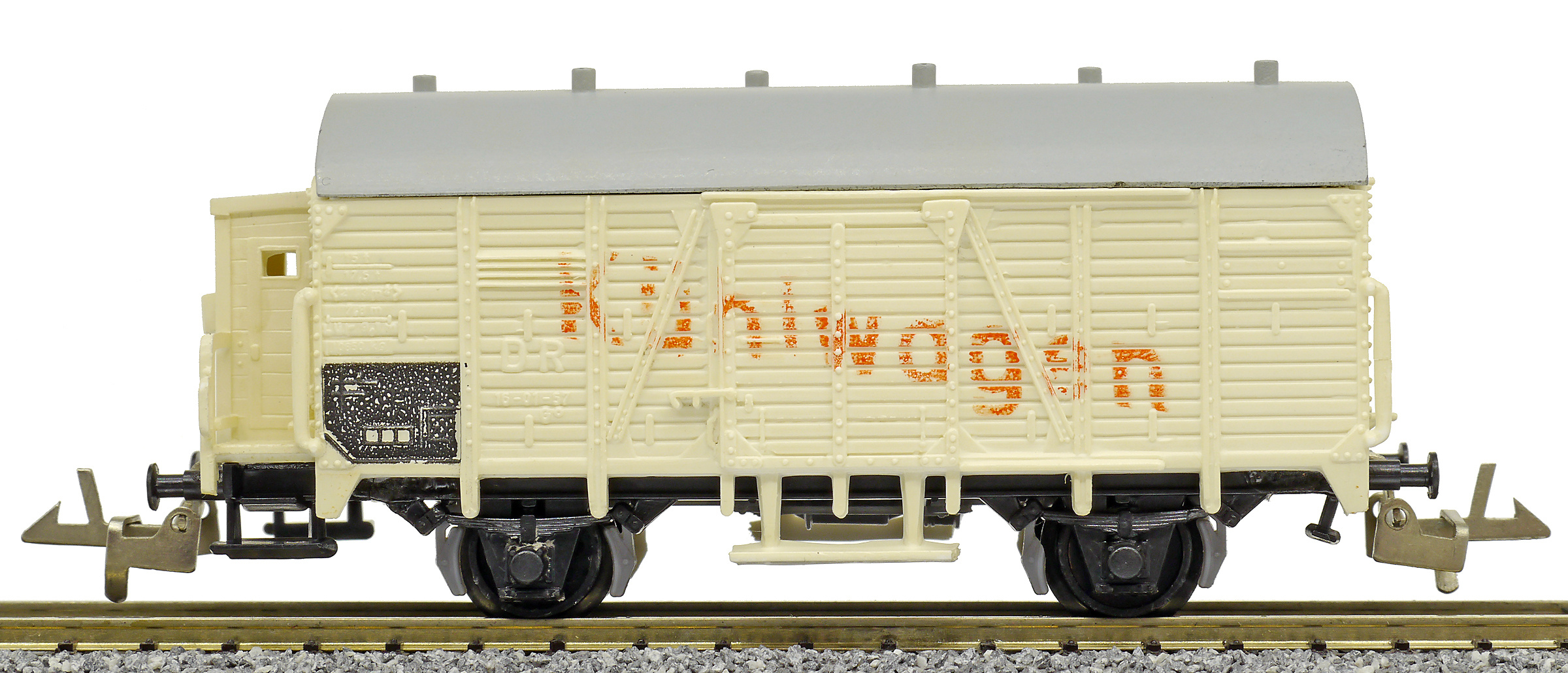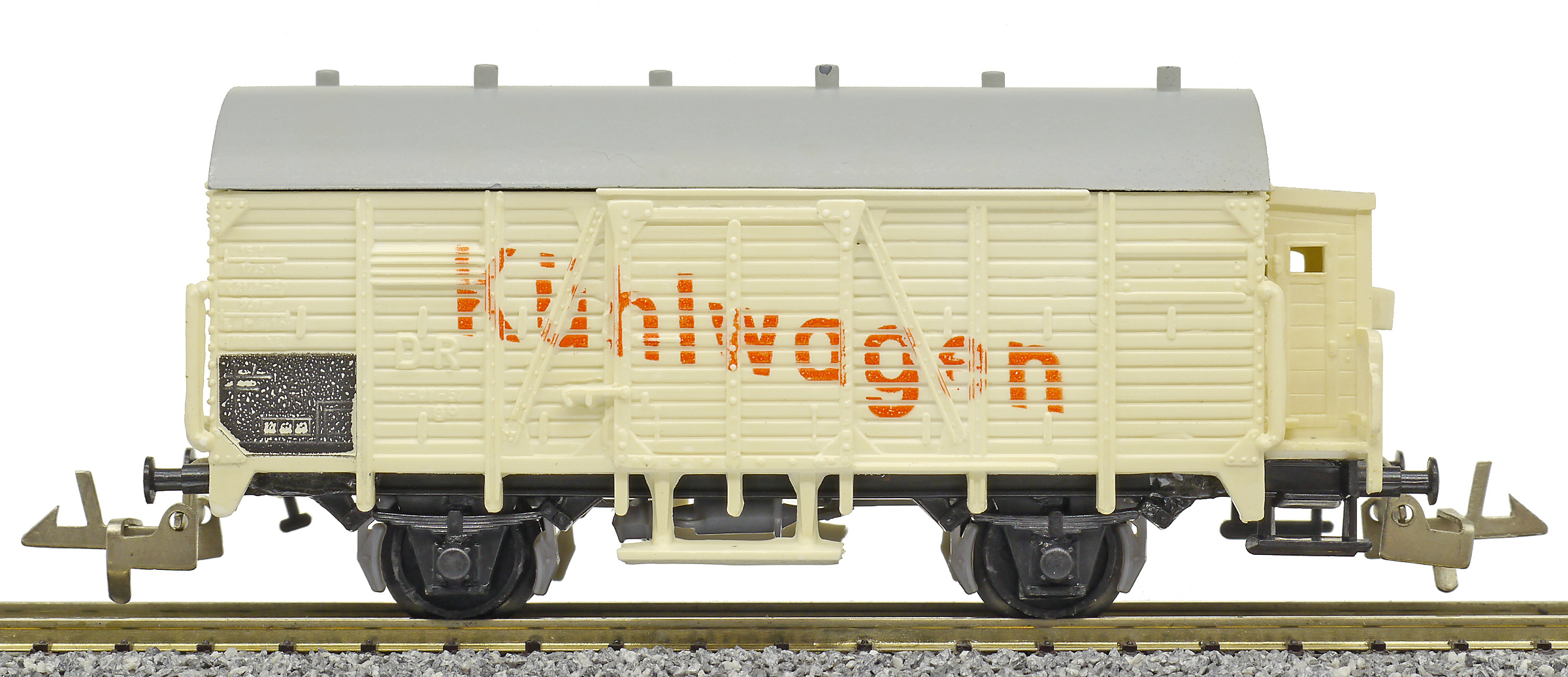 | nákladní chladící vůz světle krémý s šedou střechou „Kühlwagen“ a s brzdařskou budkou |