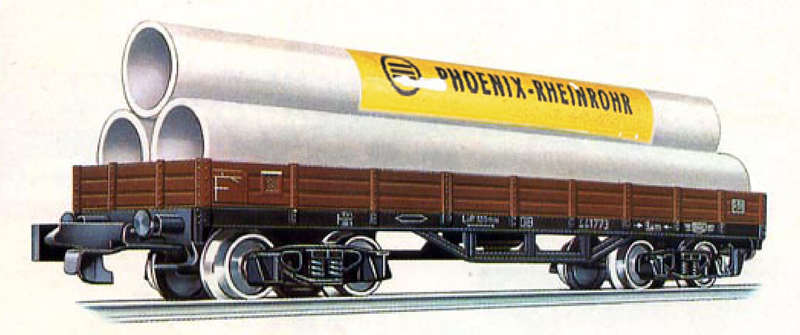 | nízkostěnný nákladní vůz červenohnědý s černým rámem s nákladem rour „PHOENIX-RHEINROHR“ |