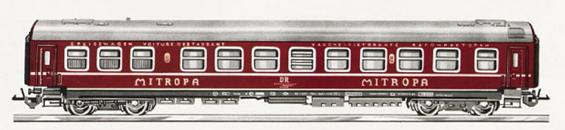 | jídelní vůz červený s šedou střechou jídelní „MITROPA“ |