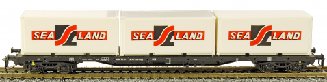| nákladní plošinový vůz černý se třemi kontejnery 20' „SEA LAND“ |