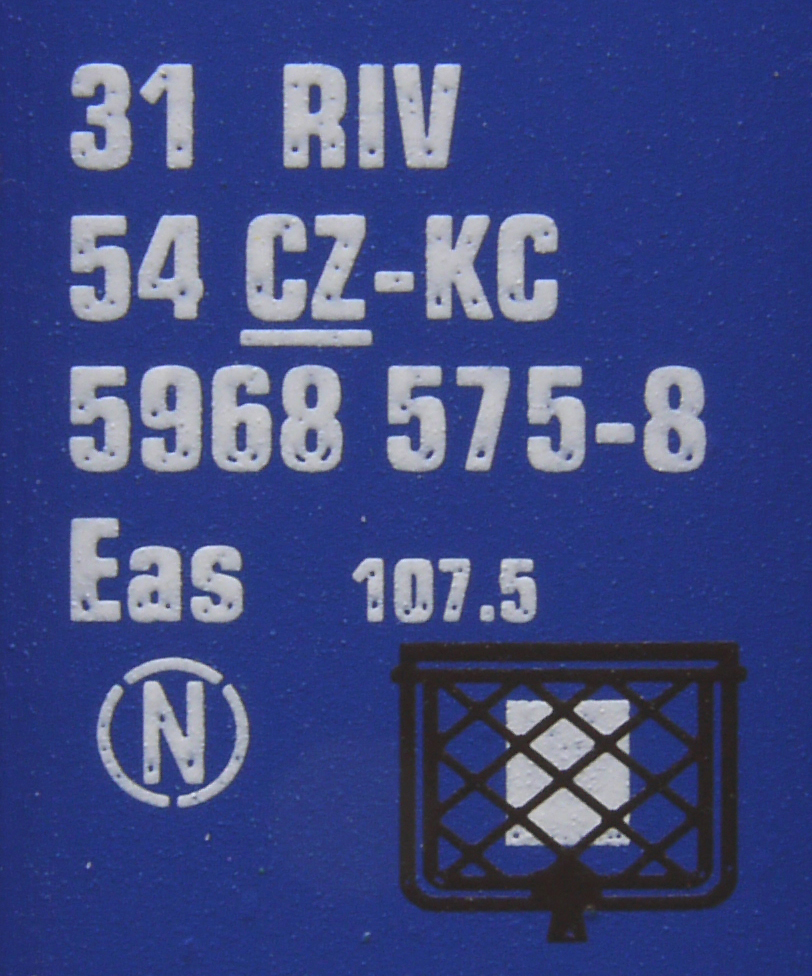 | • 31 54 5968 575-8 | → | nákladní, s podvozky, pevný rozchod, ve vlastnictví železniční správy, RIV, PPV |