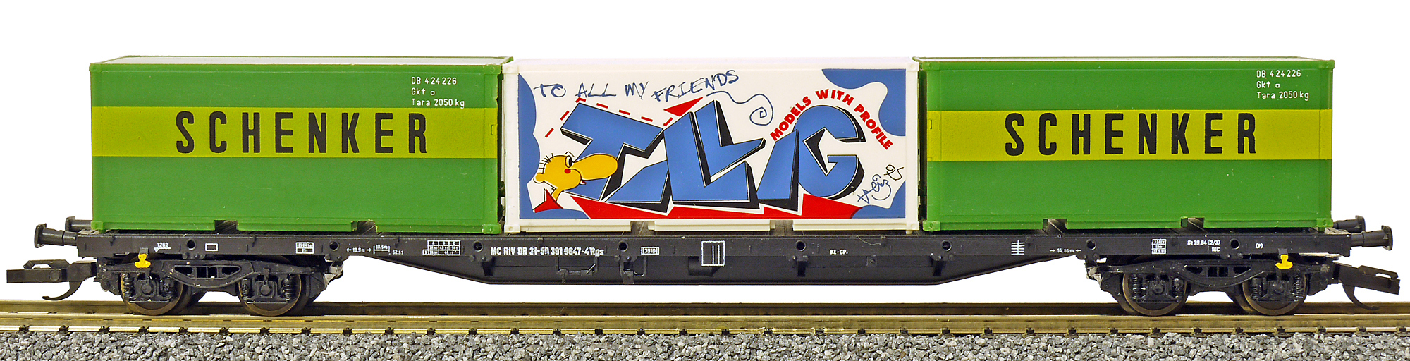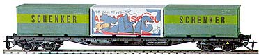 | nákladní plošinový vůz černý se třemi kontejnery 20' „SCHENKER“ a „Graffiti“ |