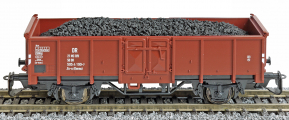 | otevřený nákladní vůz červenohnědý s nákladem uhlí |