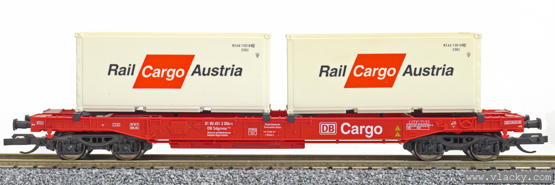 | nákladní vůz s výměnnými pryčnami a se dvěma kontejnery 20' „Rail Cargo Austria“ |