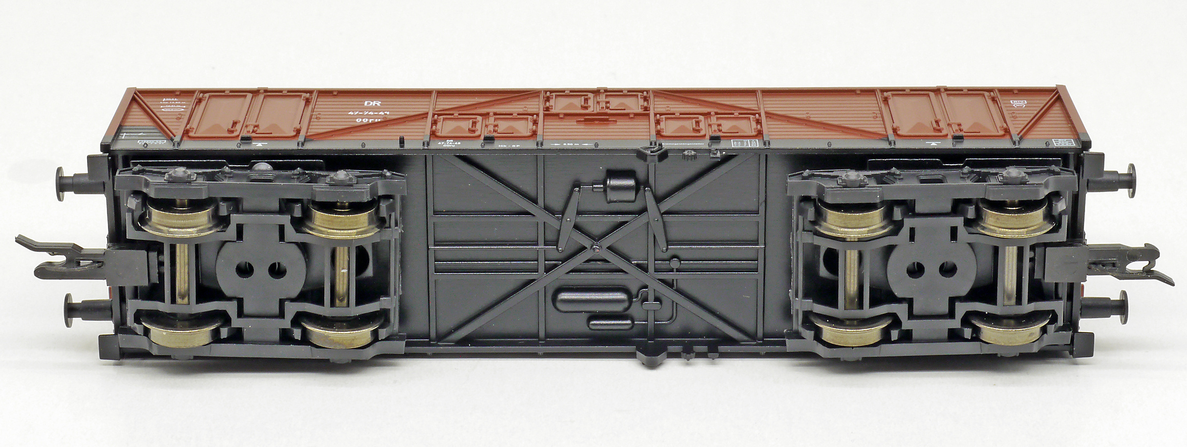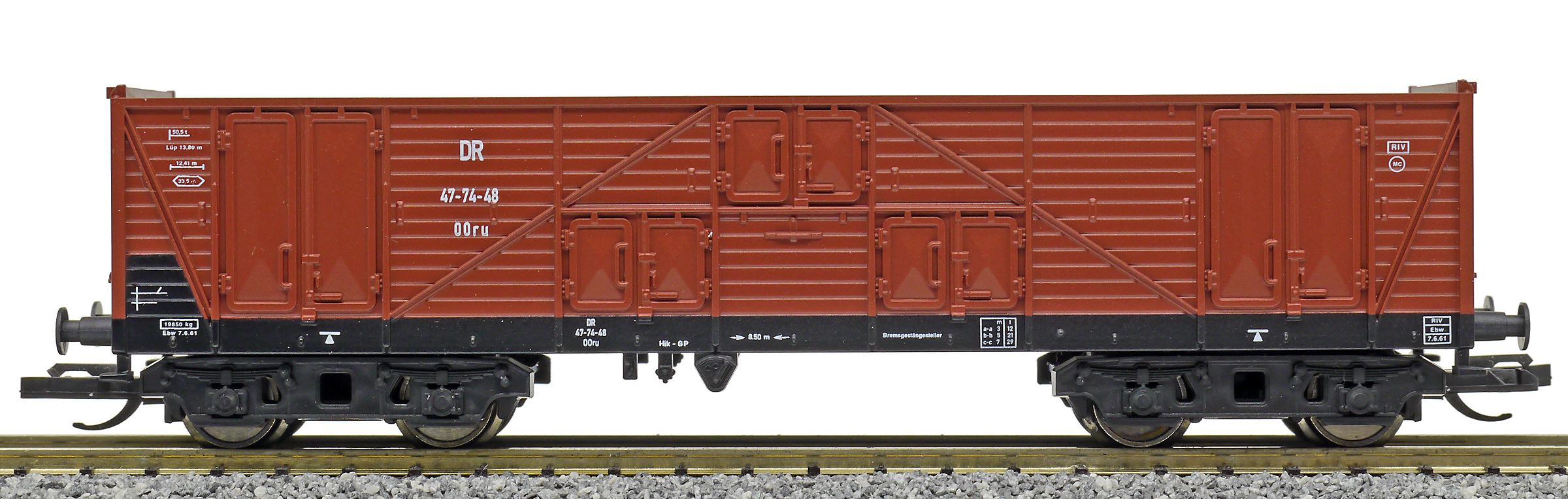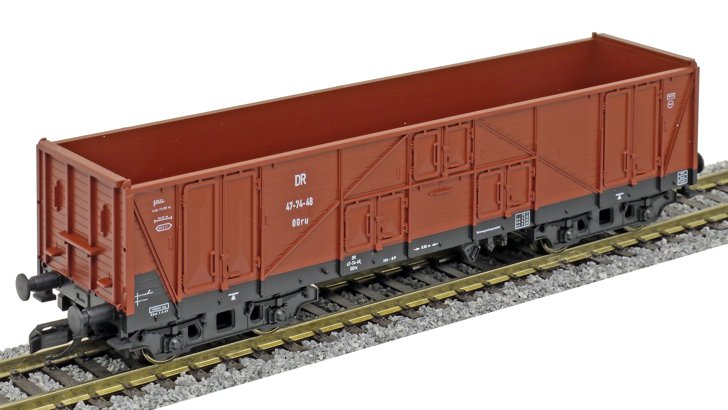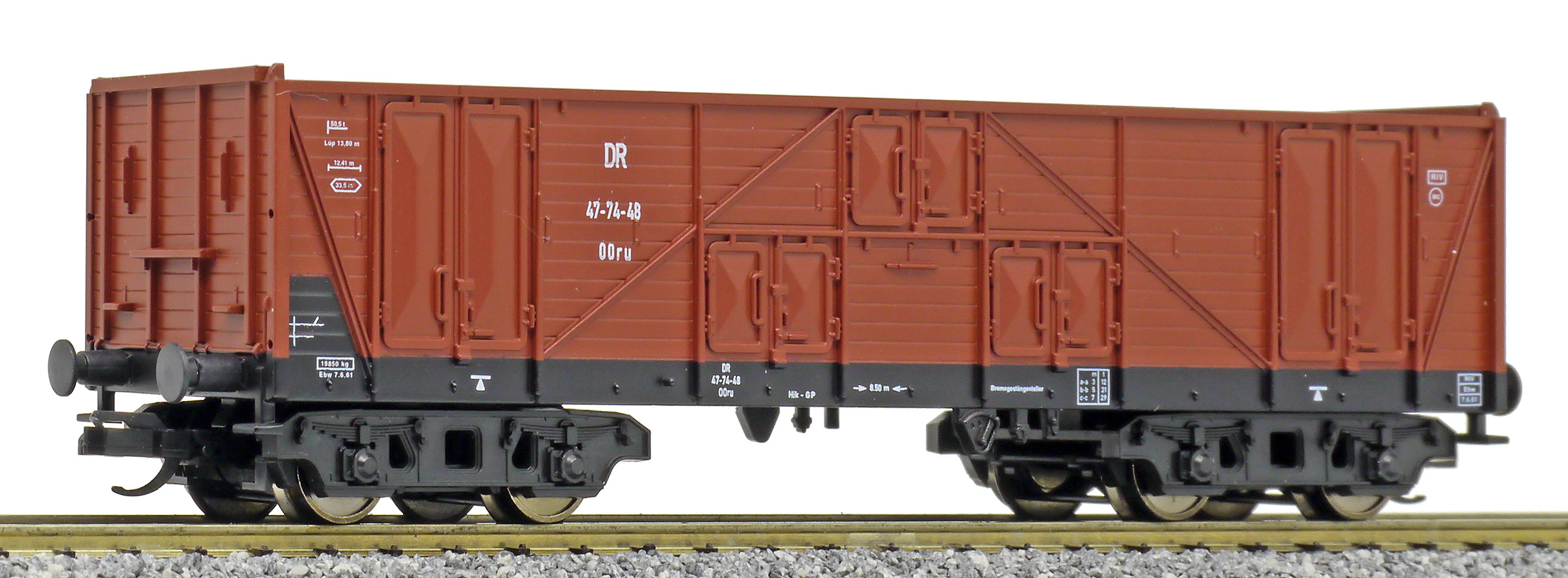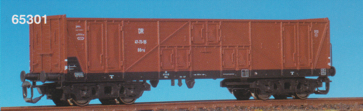 Popis   vysokostěnný nákladní vůz červenohnědý, černý rám a podvozky