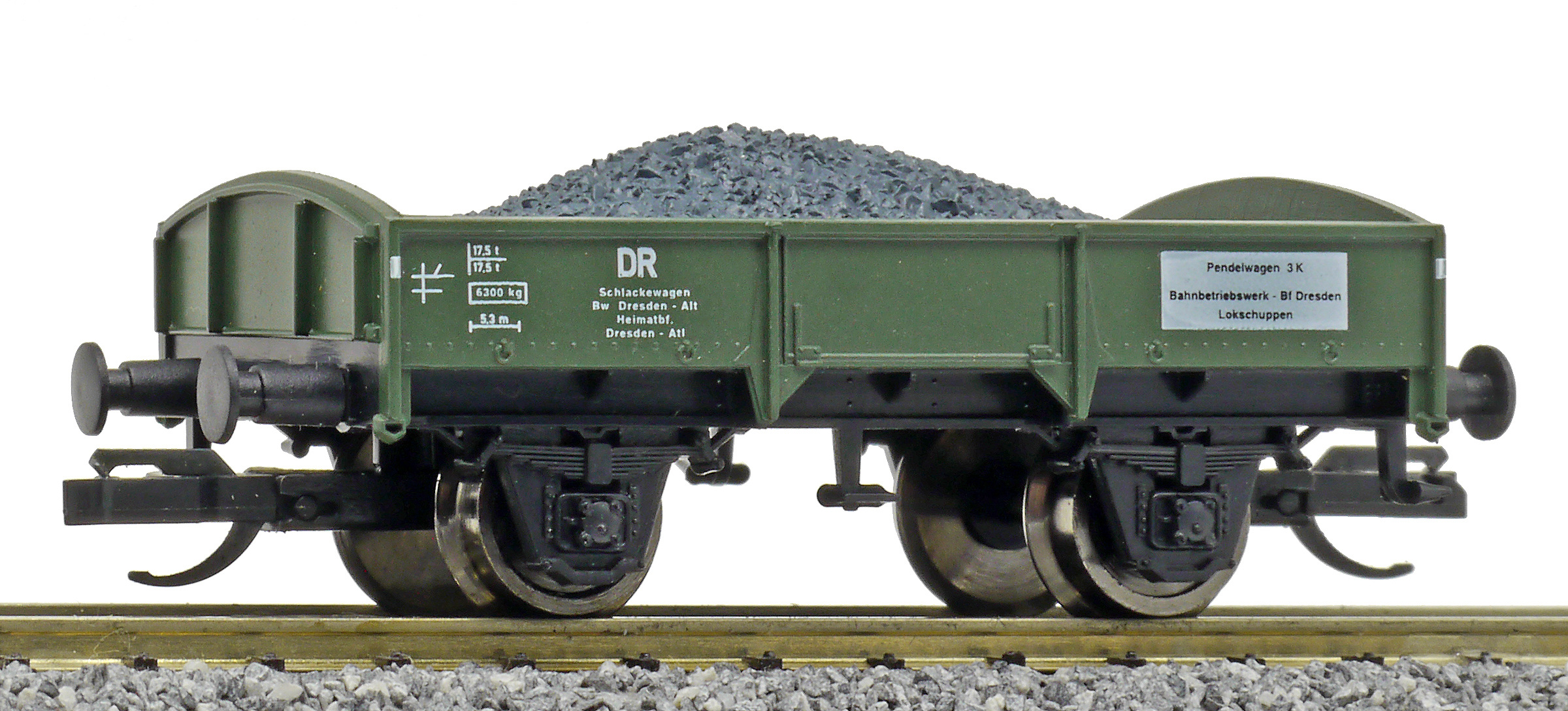 Popis   nízkostěnný nákladní vůz tmavě zelený, černý pojezd, s nákladem strusky