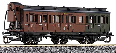 oddílový osobní vůz červenohnědý-zelený s brzdařskou budkou 2./3. tř.
