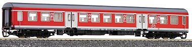 červený s bílými proužky a dveřmi a s šedou střechou a oddílem na kola