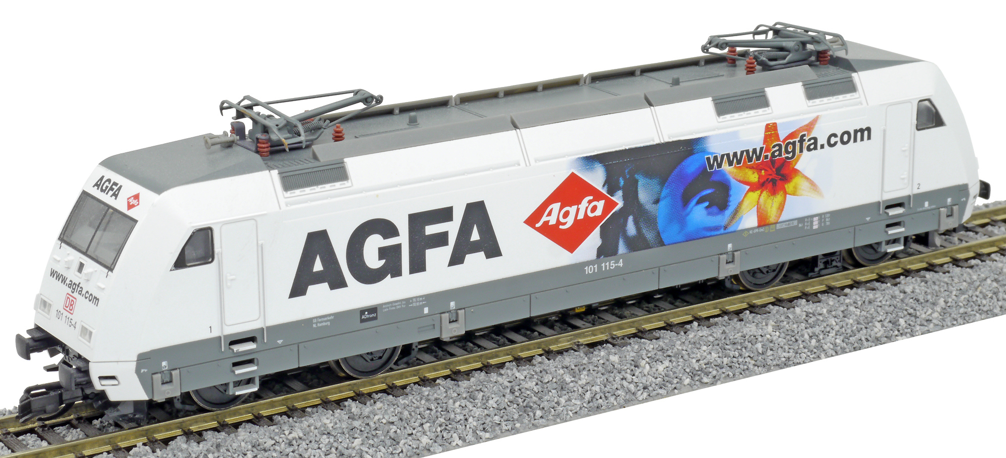 Popis   elektrická lokomotiva bílá s šedým rámem a reklamním potiskem „AGFA“