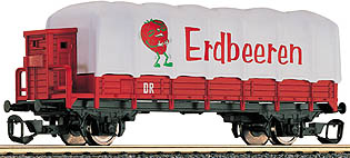 Popis   nízkostěnný nákladní vůz červenohnědý s plachtou „Erdbeeren“ a s brzdařskou budkou