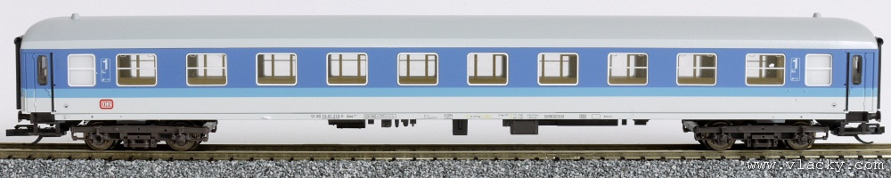 modrý-bílý se světlešedou střechou rychlíkový vůz typ m 1. tř.