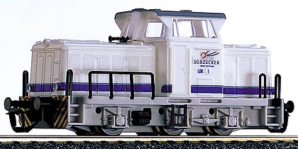 dieselová lokomotiva bílá s modrým pruhem a šedým pojezdem „Südzucker AG“