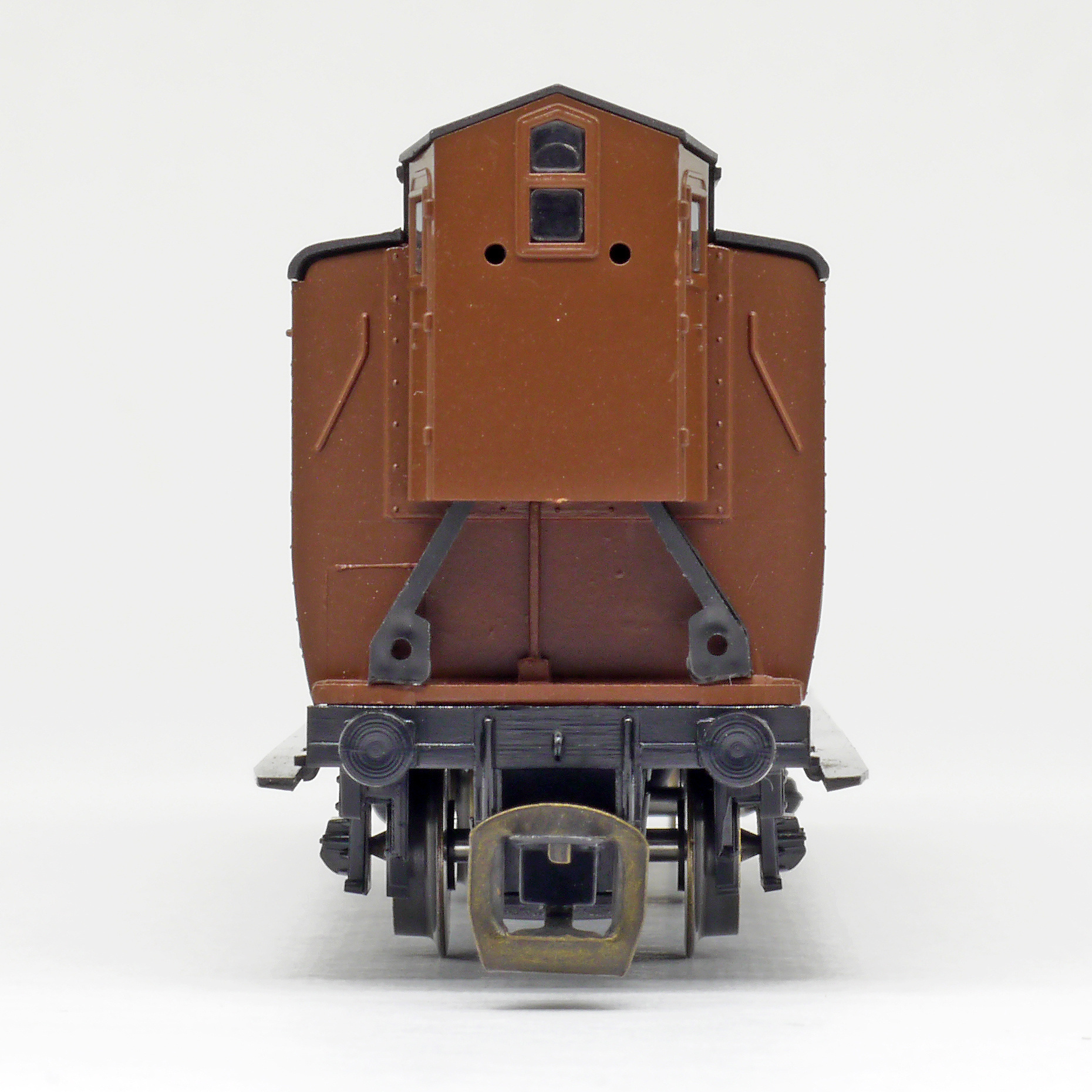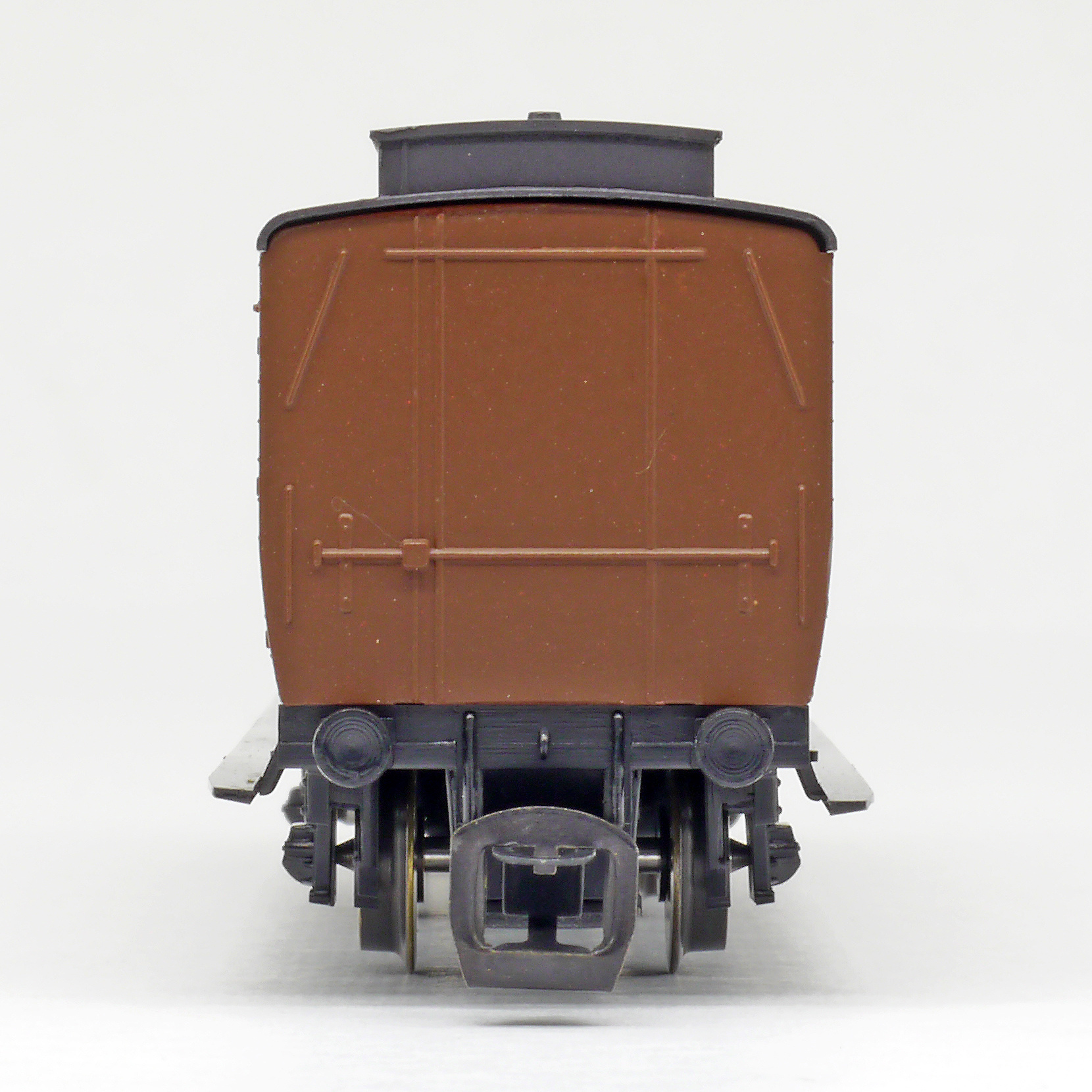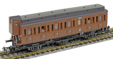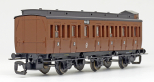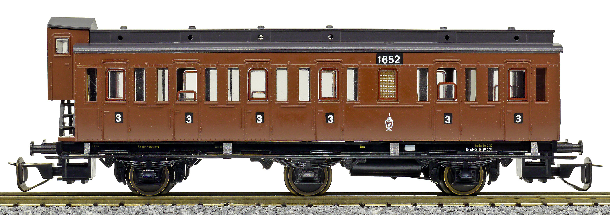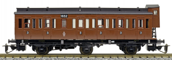 oddílový osobní vůz červený s černou střechou a s brzdařskou budkou 3. tř.