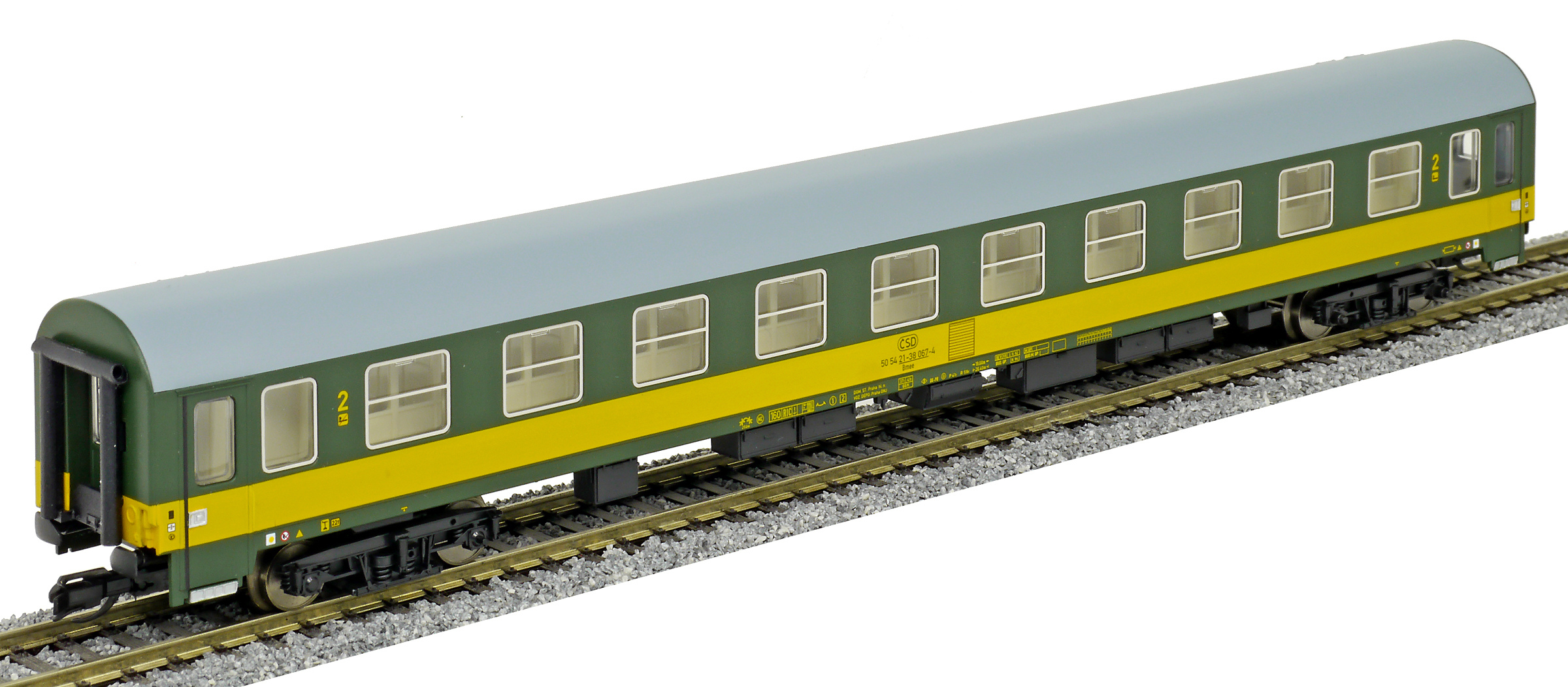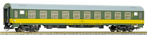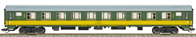 | rychlíkový vůz zelený se žlutým pruhem a šedou střechou 2. tř. |