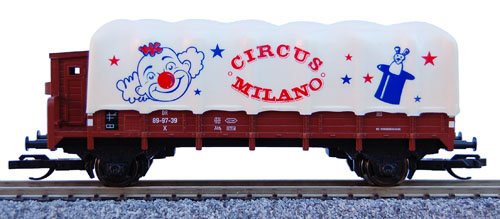 červenohnědý s brzdařskou budkou a plachtou "Cirkus Milano"