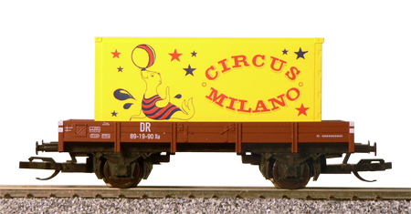 | nízkostěnný nákladní vůz červenohnědý se žlutým kontejnerem „Circus Milano“ |