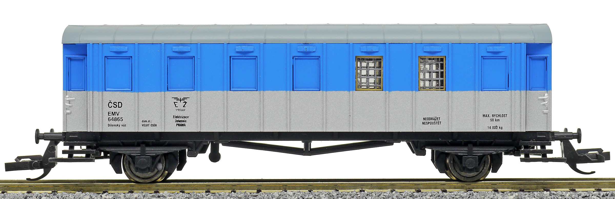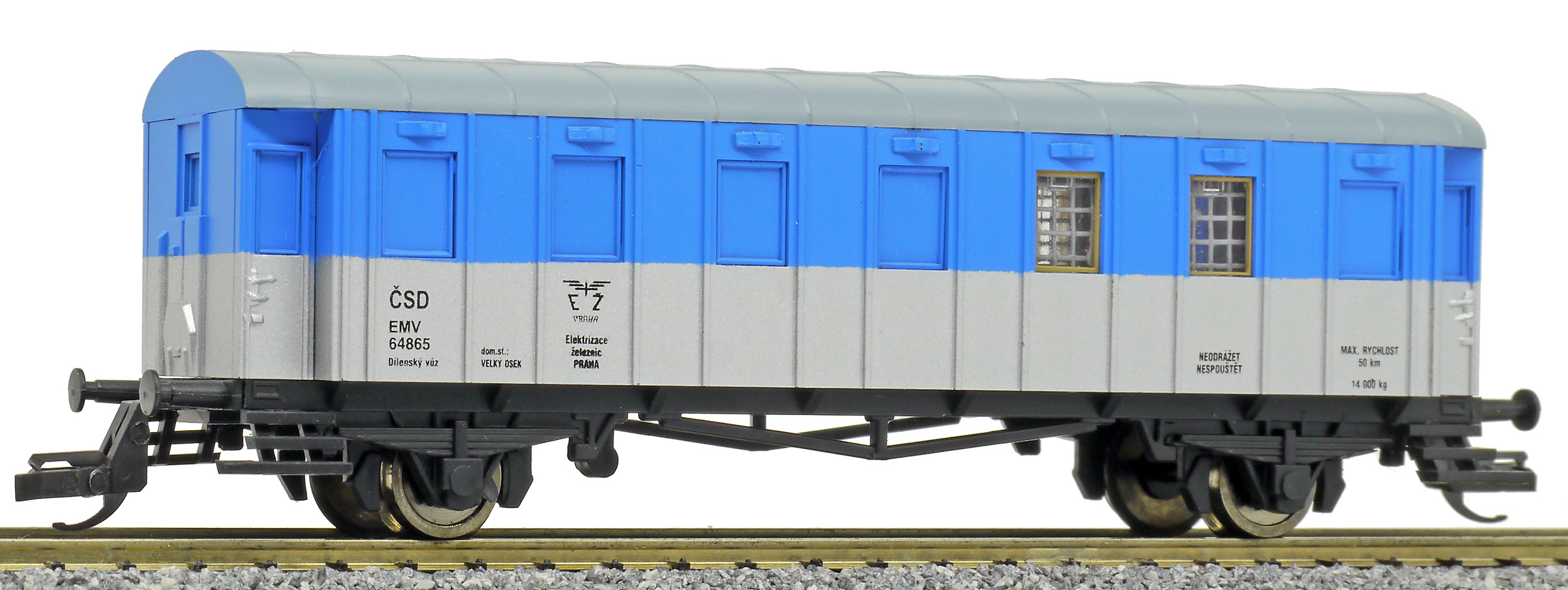 | dílenský vůz modrý-stříbrný s šedou střechou „Elektrizace železnic“ |