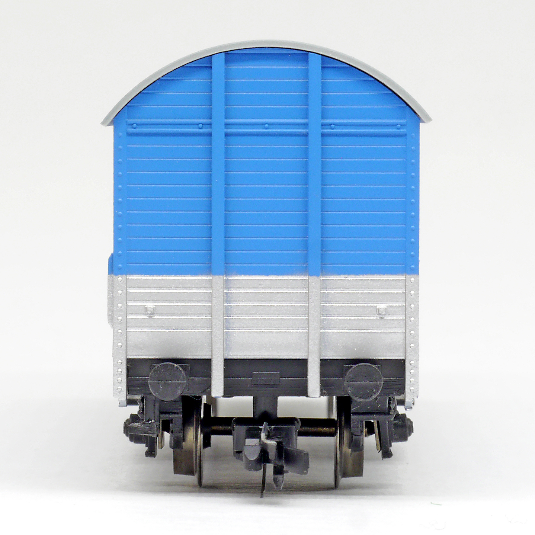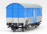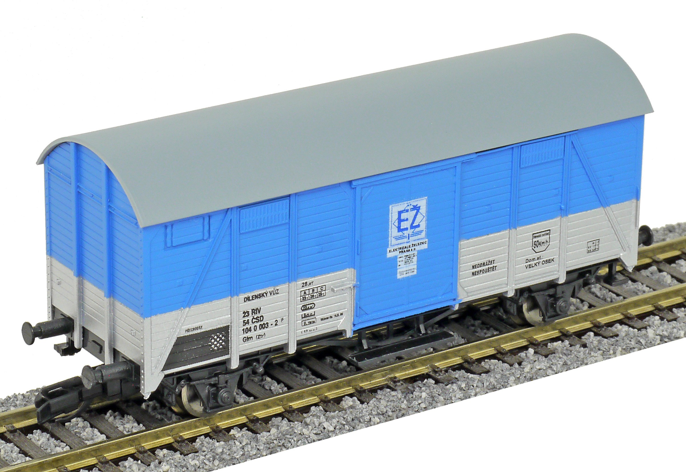 | krytý nákladní vůz modrý-stříbrný s šedou střechou dílenský vůz „Elektrizace železnic“ |