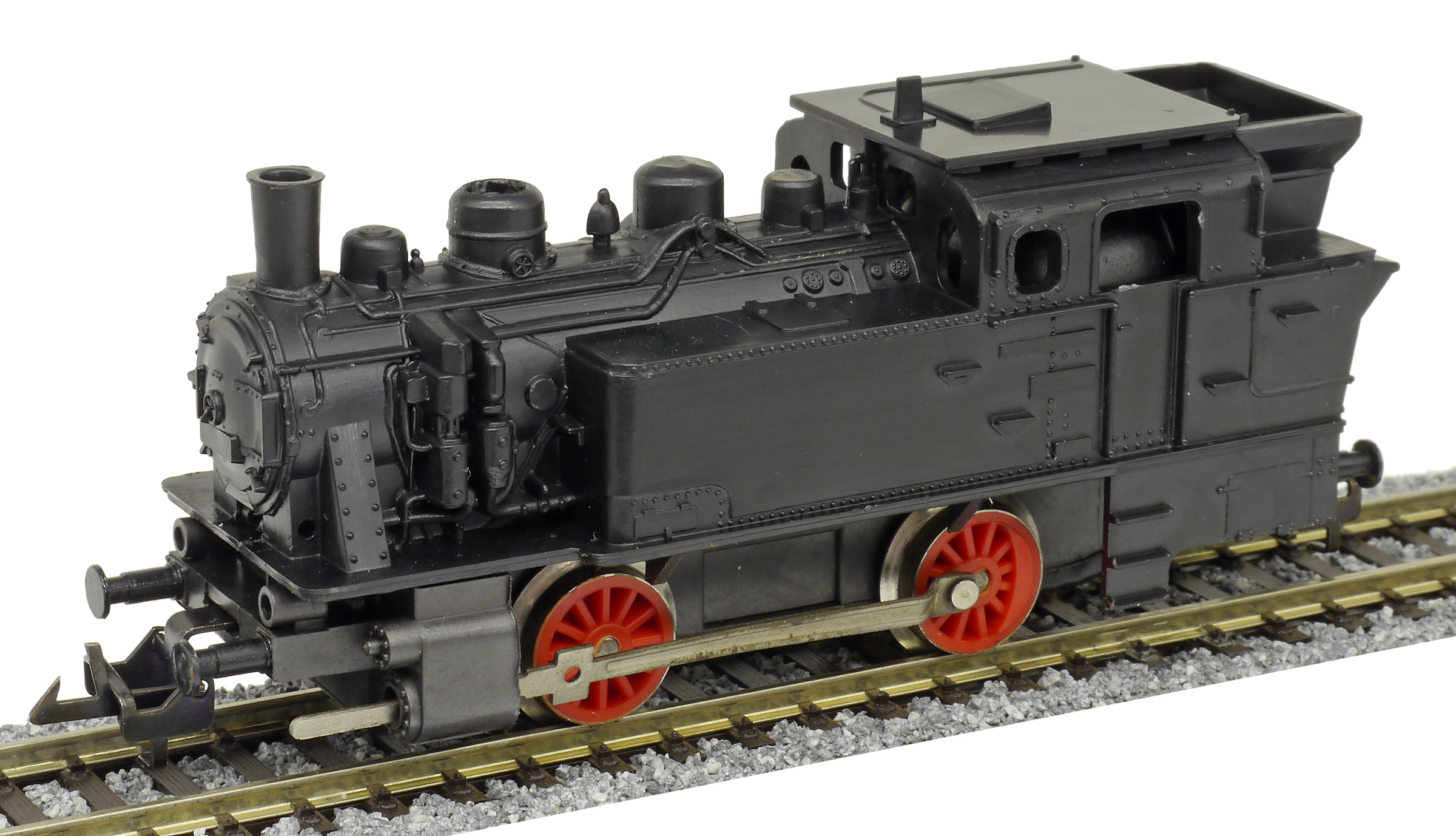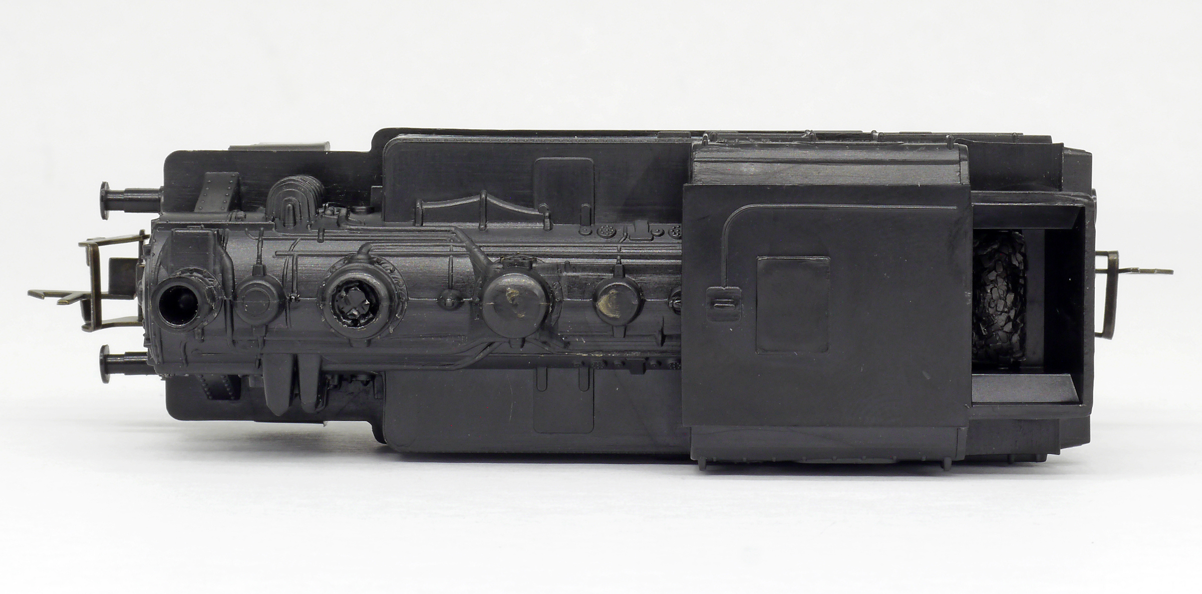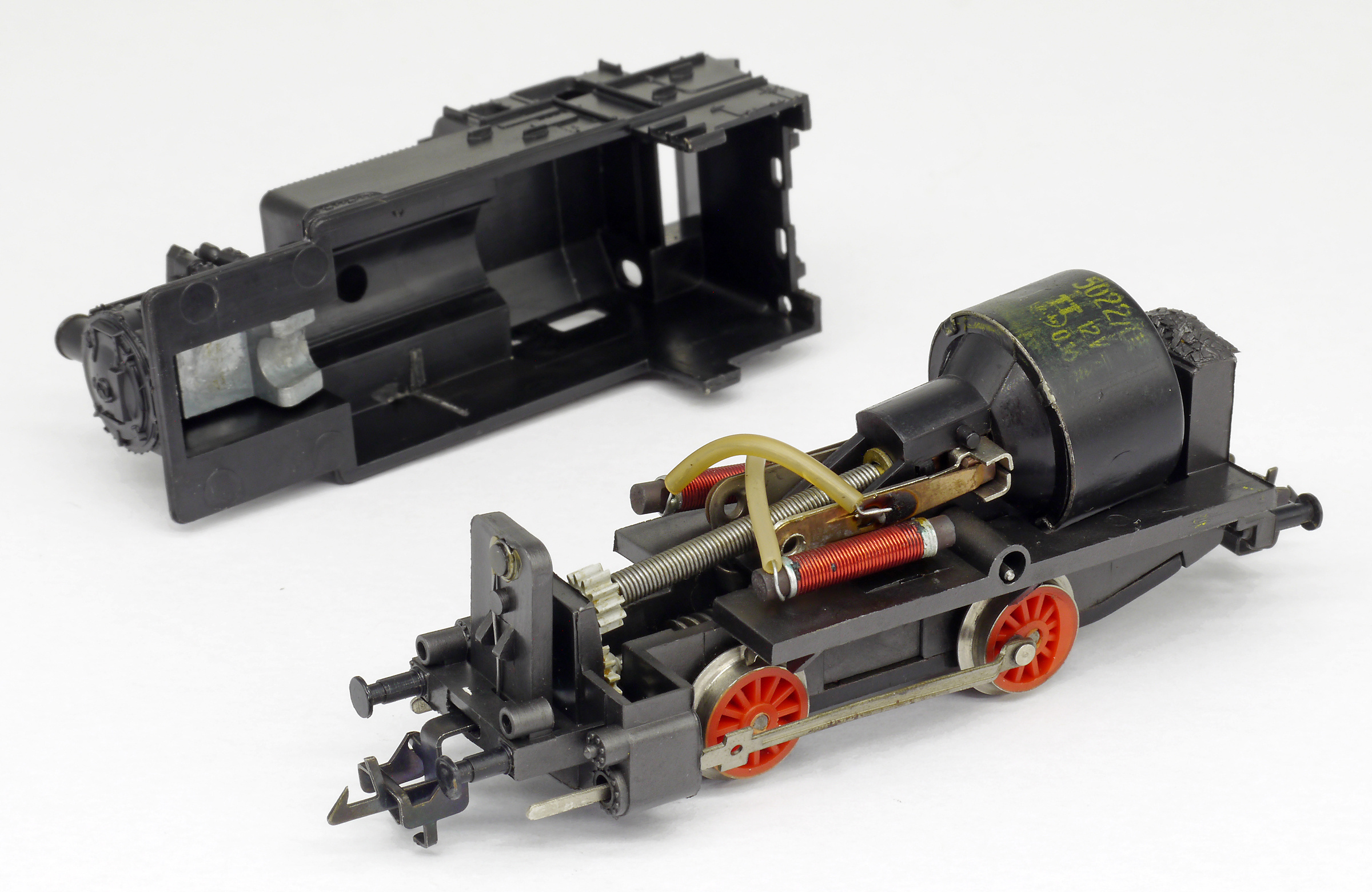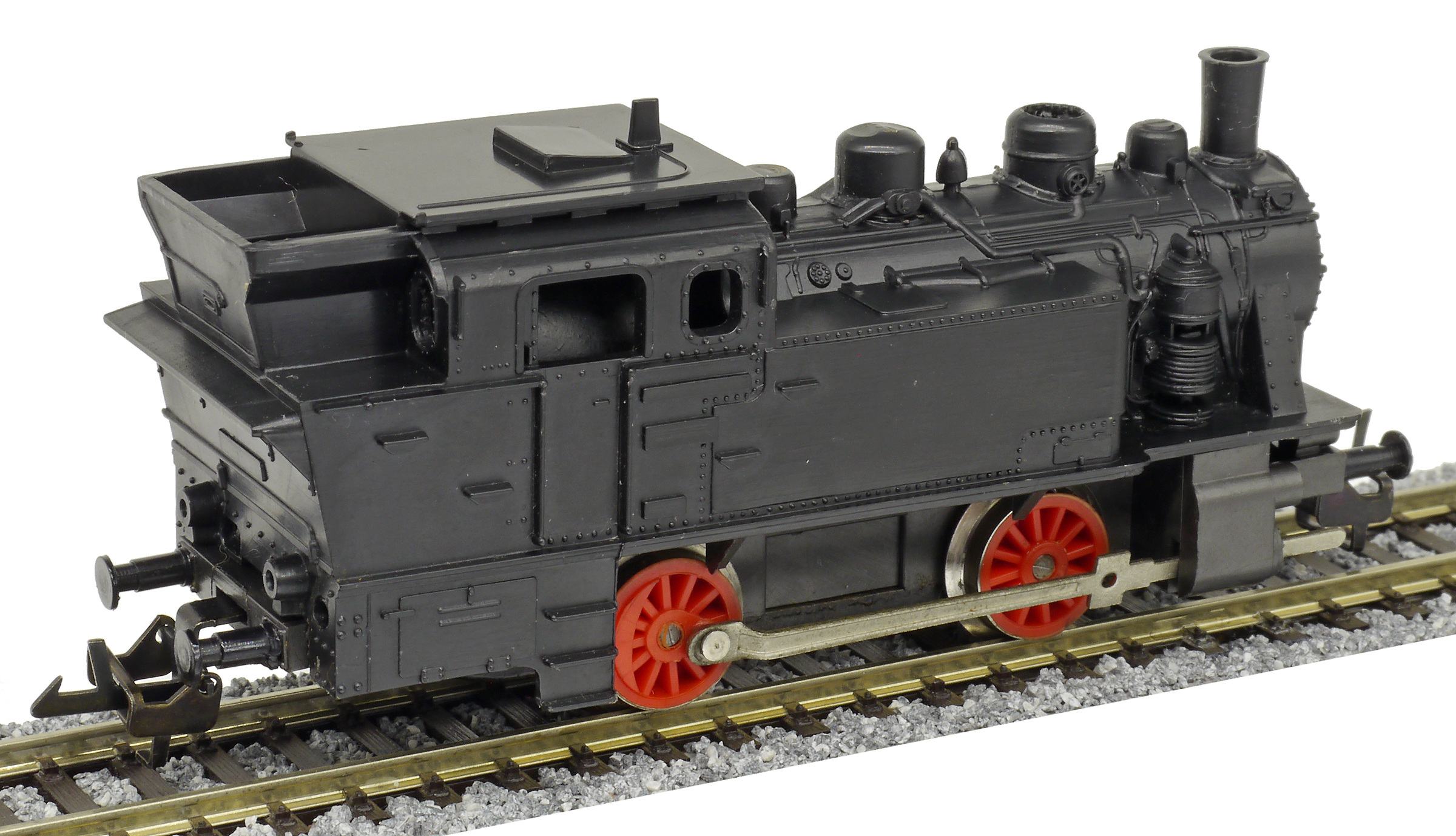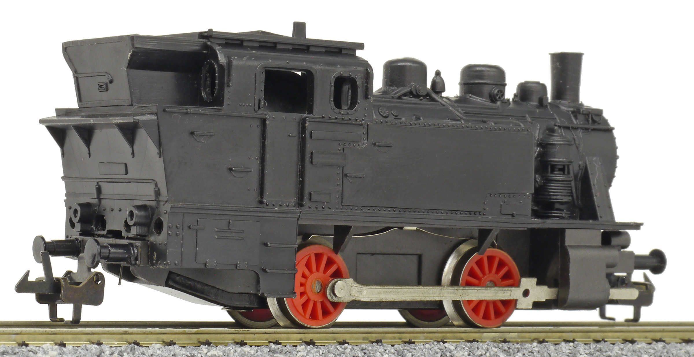 | parní lokomotiva černá v barvě plastu bez potisku, zjednodušený rozvod |