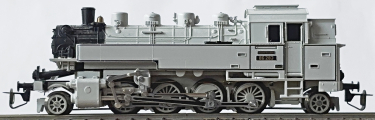 | parní lokomotiva v šedém fotonátěru s černou dýmnicí |