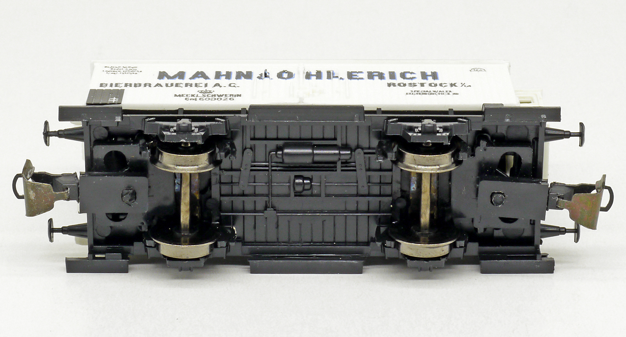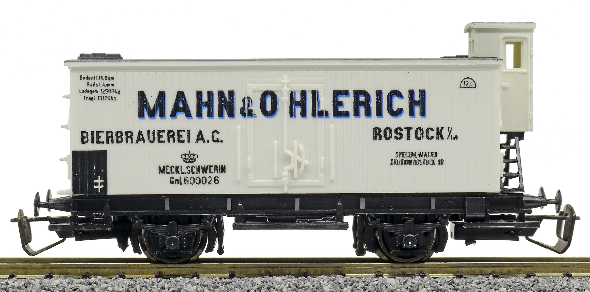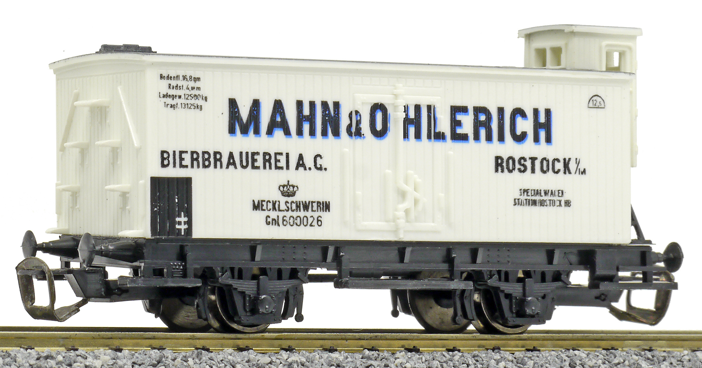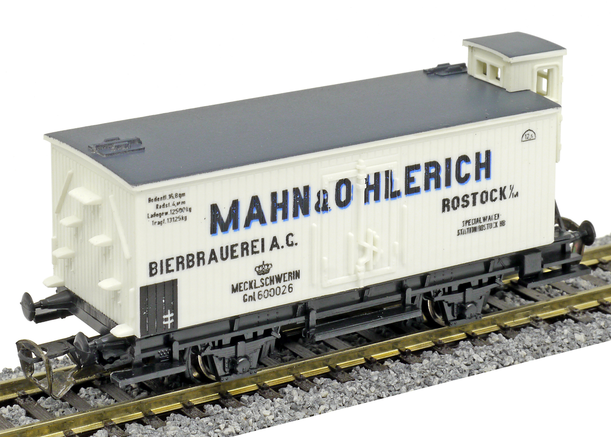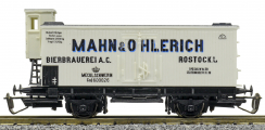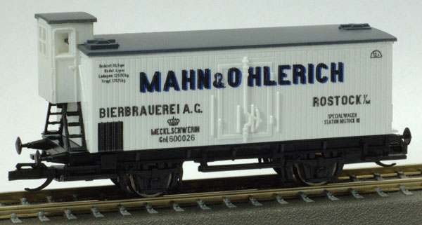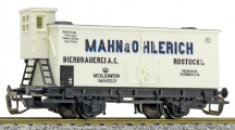 | nákladní chladící vůz bílý s šedou střechou a brzdařskou budkou „Mahn & Ohlerich“ |