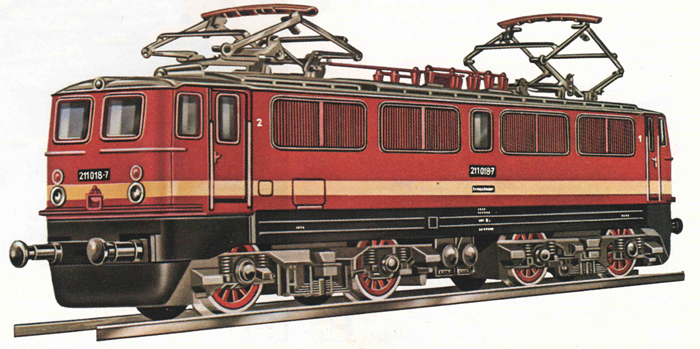 Popis   elektrická lokomotiva červená s krémovým pásem, černým rámem, šedou střechou a podvozky