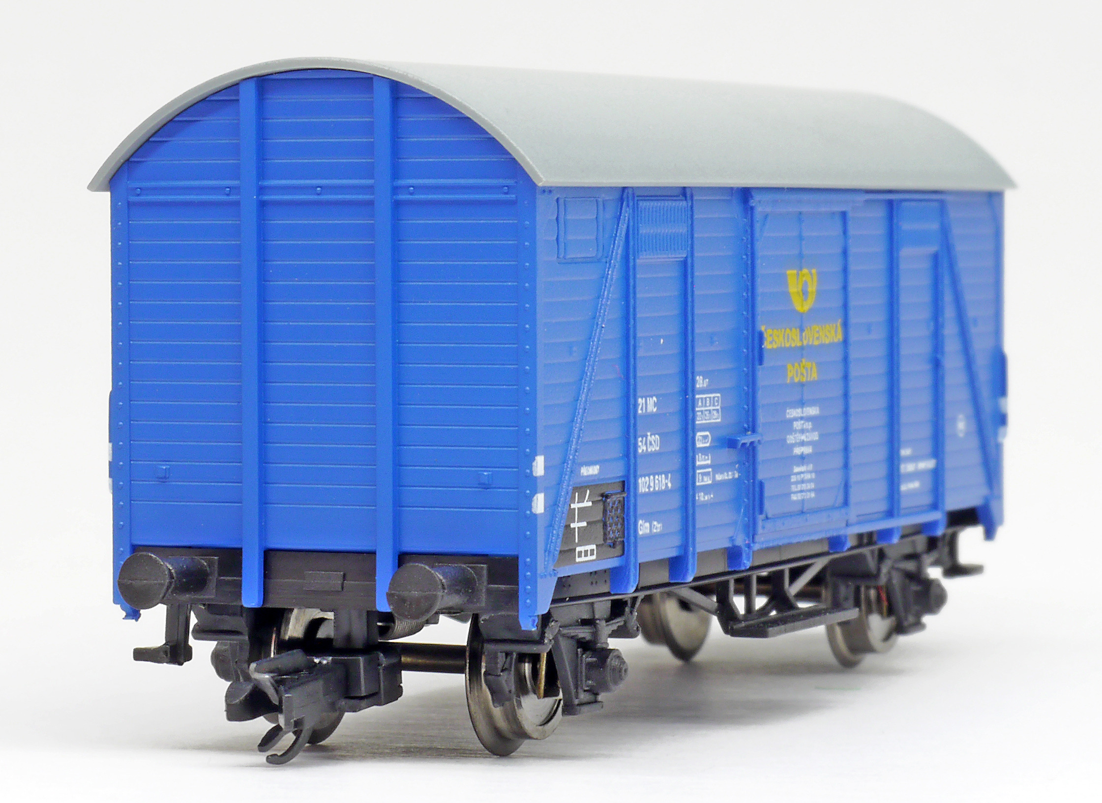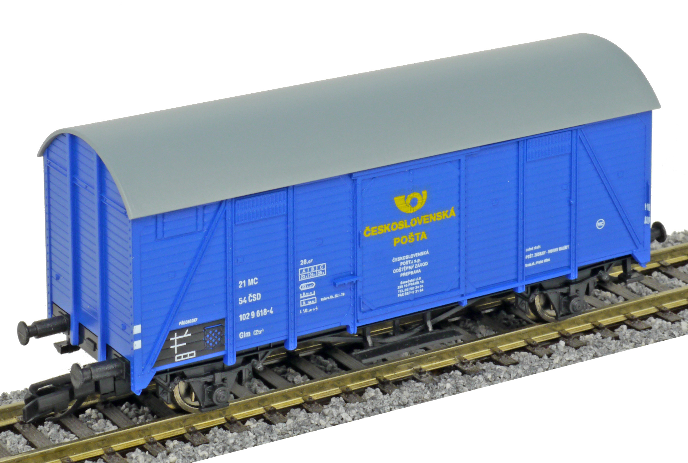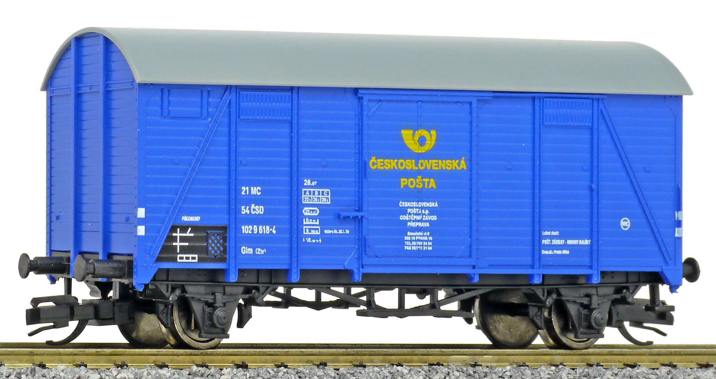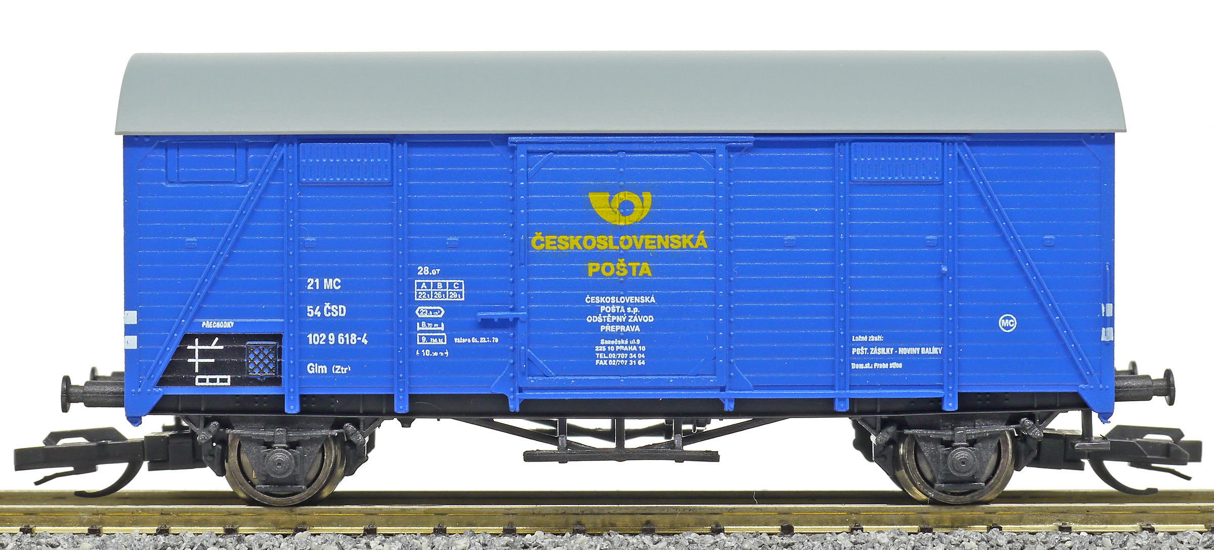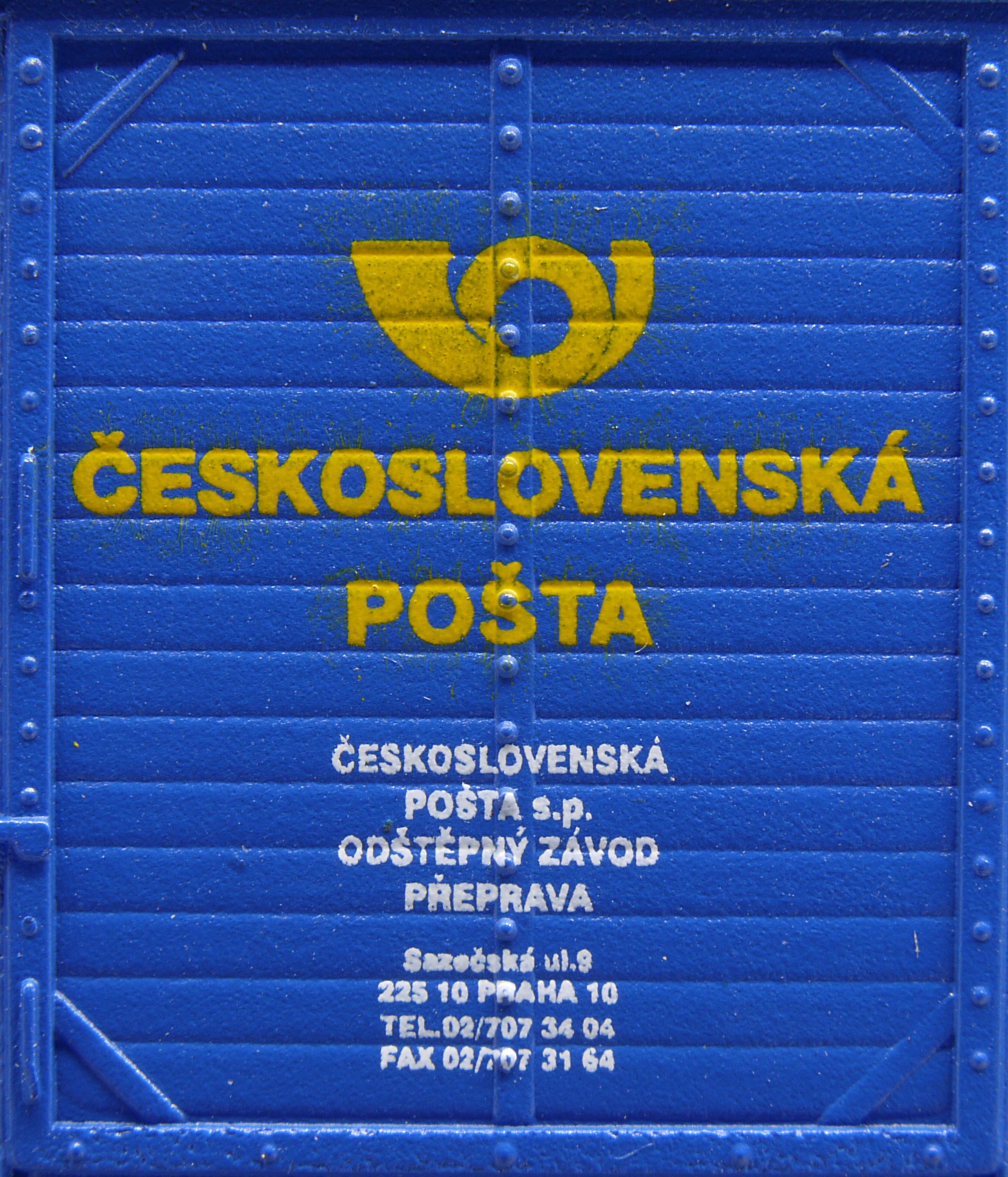 | krytý nákladní vůz modrý s šedou střechou „Československá pošta - Praha” |