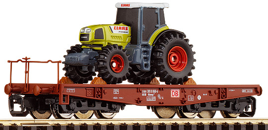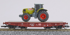 | plošinový vůz červenohnědý s nákladem traktoru |