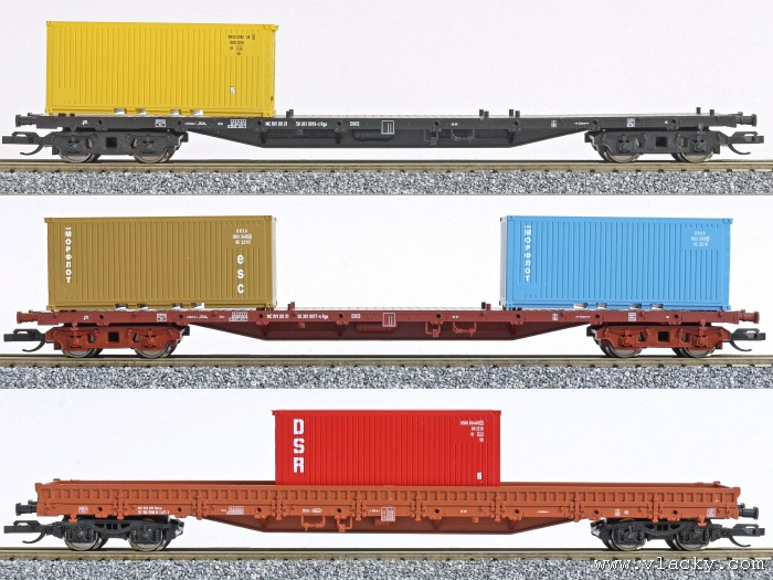| set tří nízkostěnných vozů s nákladem kontejnerů |