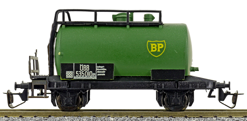 kotlový vůz zelený s černým pojezdem a s logem „BP“