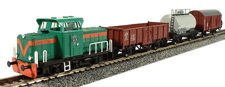 set motorové lokomotivy a tří nákladních vozů