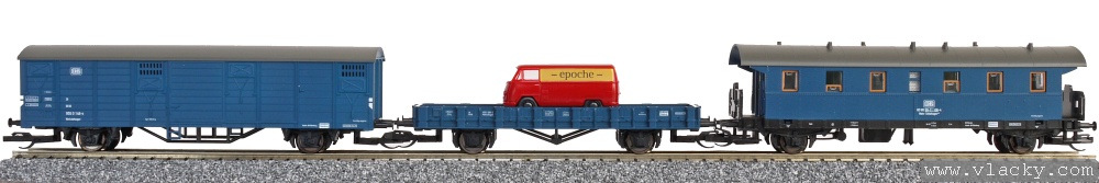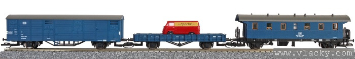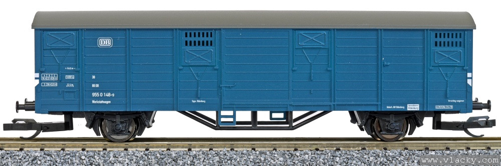 | krytý nákladní vůz tmavěmodrý s šedou střechou do pracovního vlaku |