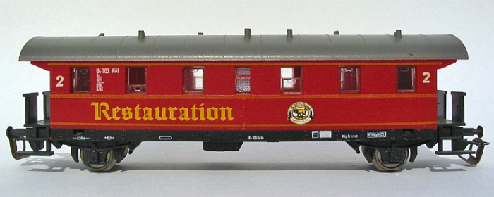 Popis   červený se stříbrnou střechou „Restaurationswagen der Ulmer Eisenbahnffreunde“