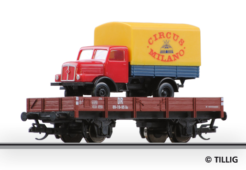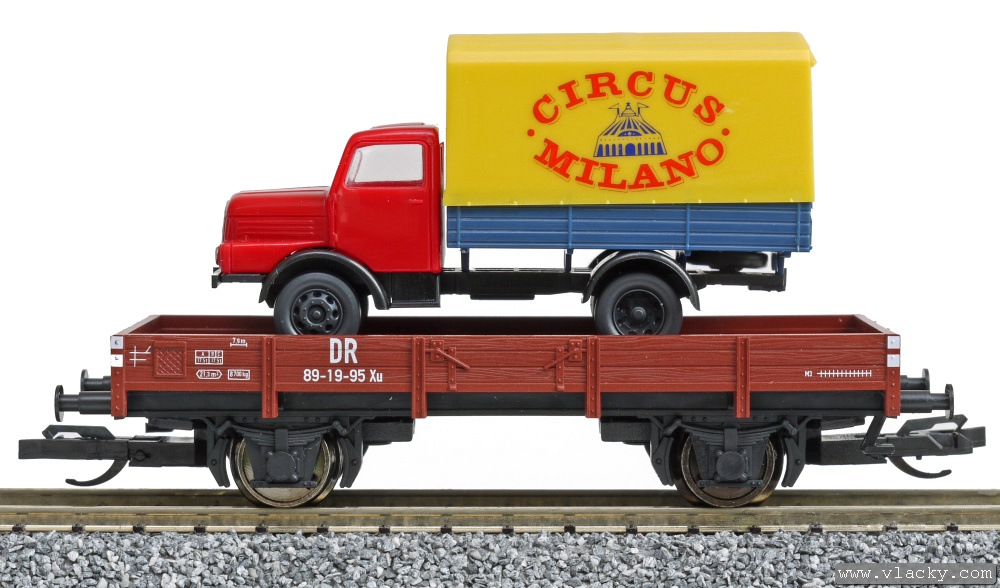 | nízkostěnný nákladní vůz červenohnědý s nákladním vozem H3A „Circus Milano“ |