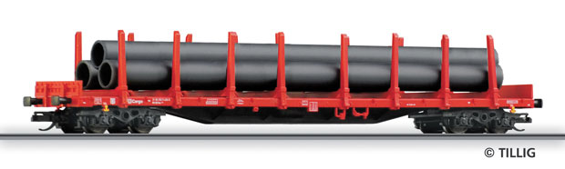 | nákladní plošinový vůz červený s klanicemi s nákladem rour |