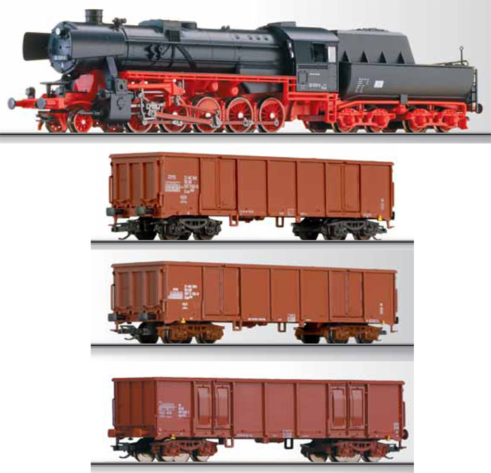 | set parní lokomotivy BR 52 a tří otevřených vysokostěnných vozů s nákladem uhlí |