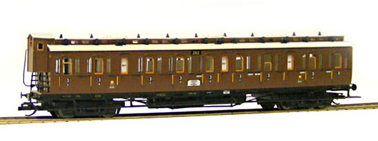 | oddílový osobní vůz červenohnědý 3. tř. s brzdařskou budkou |