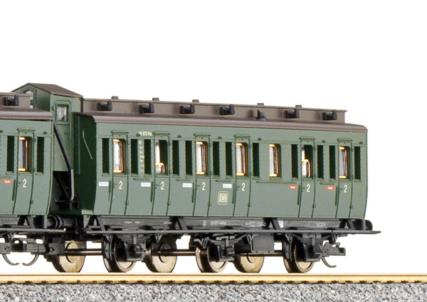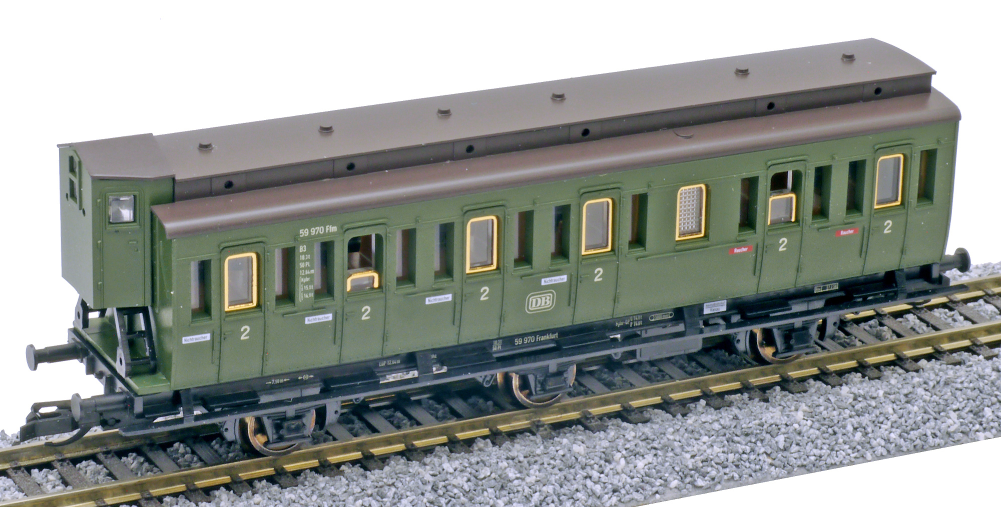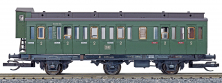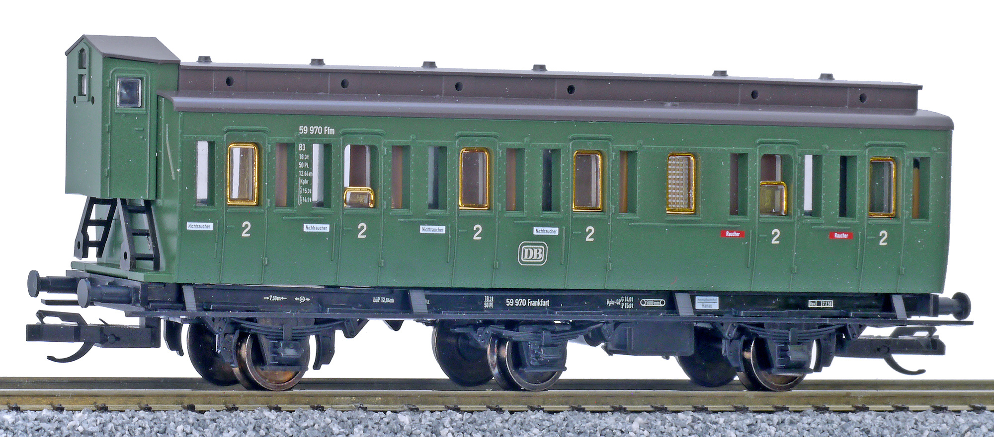 oddílový osobní vůz zelený s černou střechou a brzdařskou budkou 2. tř.