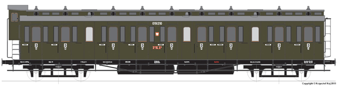 oddílový osobní vůz zelený s šedou střechou a brzdařskou budkou 3. tř., st. Katowice
