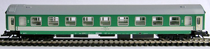 | rychlíkový vůz zelený s bílým pruhem a šedou střechou 2. tř. |