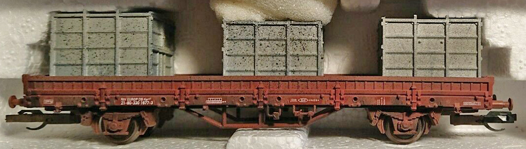 | nízkostěnný nákladní vůz červenohnědý patinovaný s nákladem tří kontejnerů |