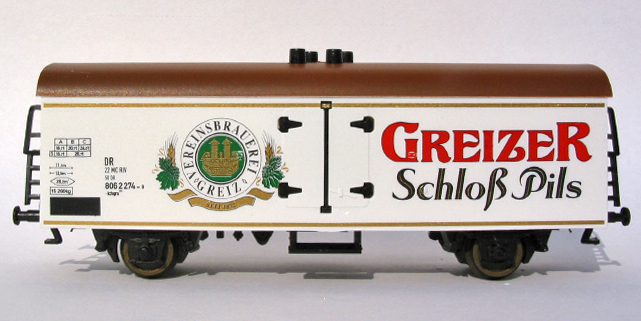 | bílý s hnědou střechou chladicí vůz na přepravu piva „Greizer“ |