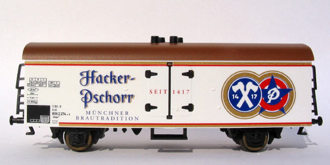 | bílý s hnědou střechou chladicí vůz na přepravu piva „Hacker“ |