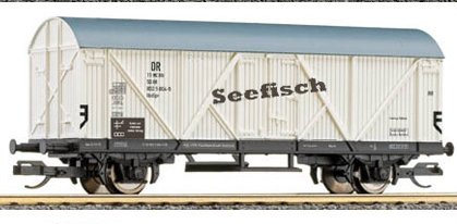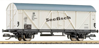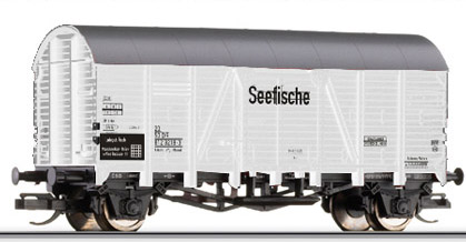 | bílý s šedou střechou pro přepravu ryb s nápisem „Seefische” |