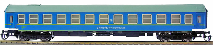 | lůžkový vůz modrý s šedou střechou „Touristenexpress“ |