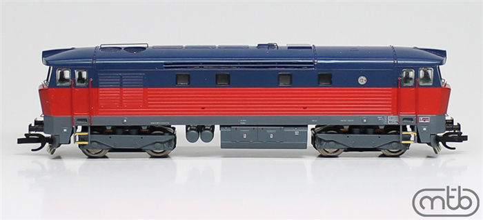Popis   dieselová lokomotiva červená-modrá s černým rámem a pojezdem